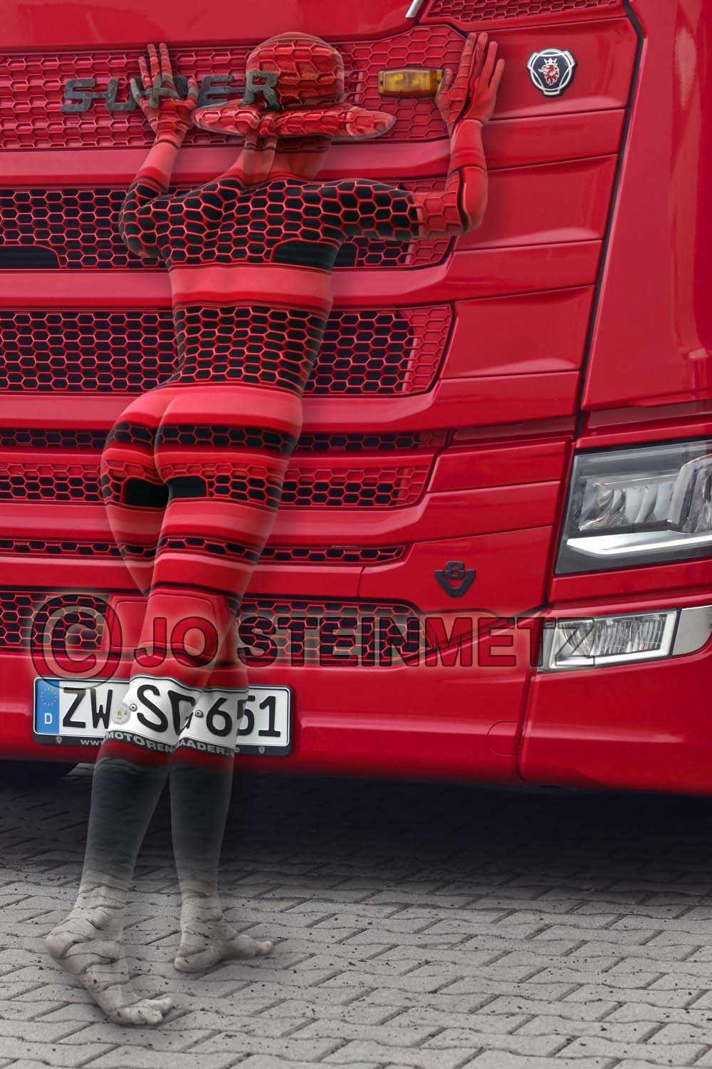 Auf dem Gelände der Zweibrücker Spedition Gillner entstand dieses Motiv. Der knallrote Lkw mit dem wabenartigen Kühlergrill war prädestiniert für diese Szene.
