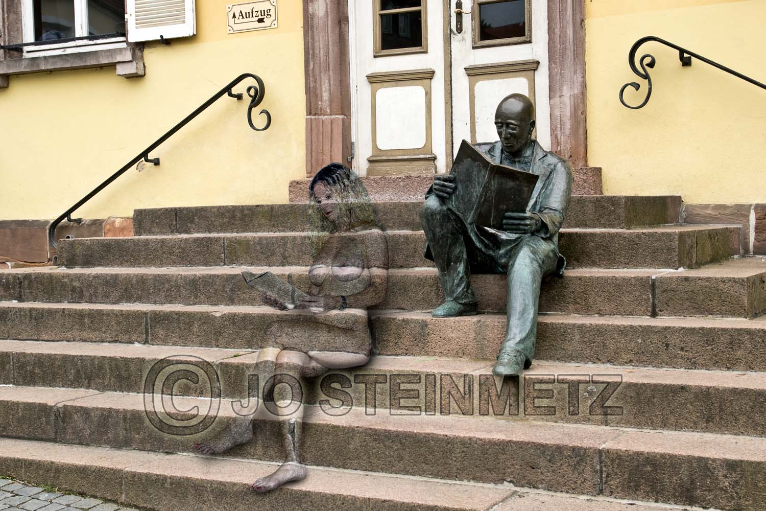 Im Alten Rathaus Homburg ist die Stadtbibliothek untergebracht. Was liegt näher, als der lesenden Bronzefigur auf der Steintreppe ein bisschen Gesellschaft zu leisten?